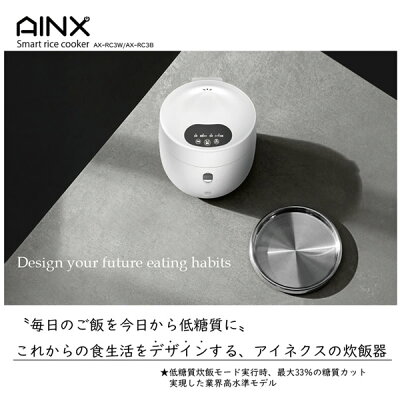 商品詳細 商品名 AINX 炊飯器 スマートライスクッカー AX-RC3 商品説明 低糖質炊飯モード実行時、最大33%の糖質カットを実現 糖質カット炊飯トレーを設置することで糖質カットする方式を採用し、炊きムラを防ぎ、糖質カット炊飯でも美味しいお米を炊くことが可能に 通常炊飯であれば、最短約20分での高速炊飯が可能。